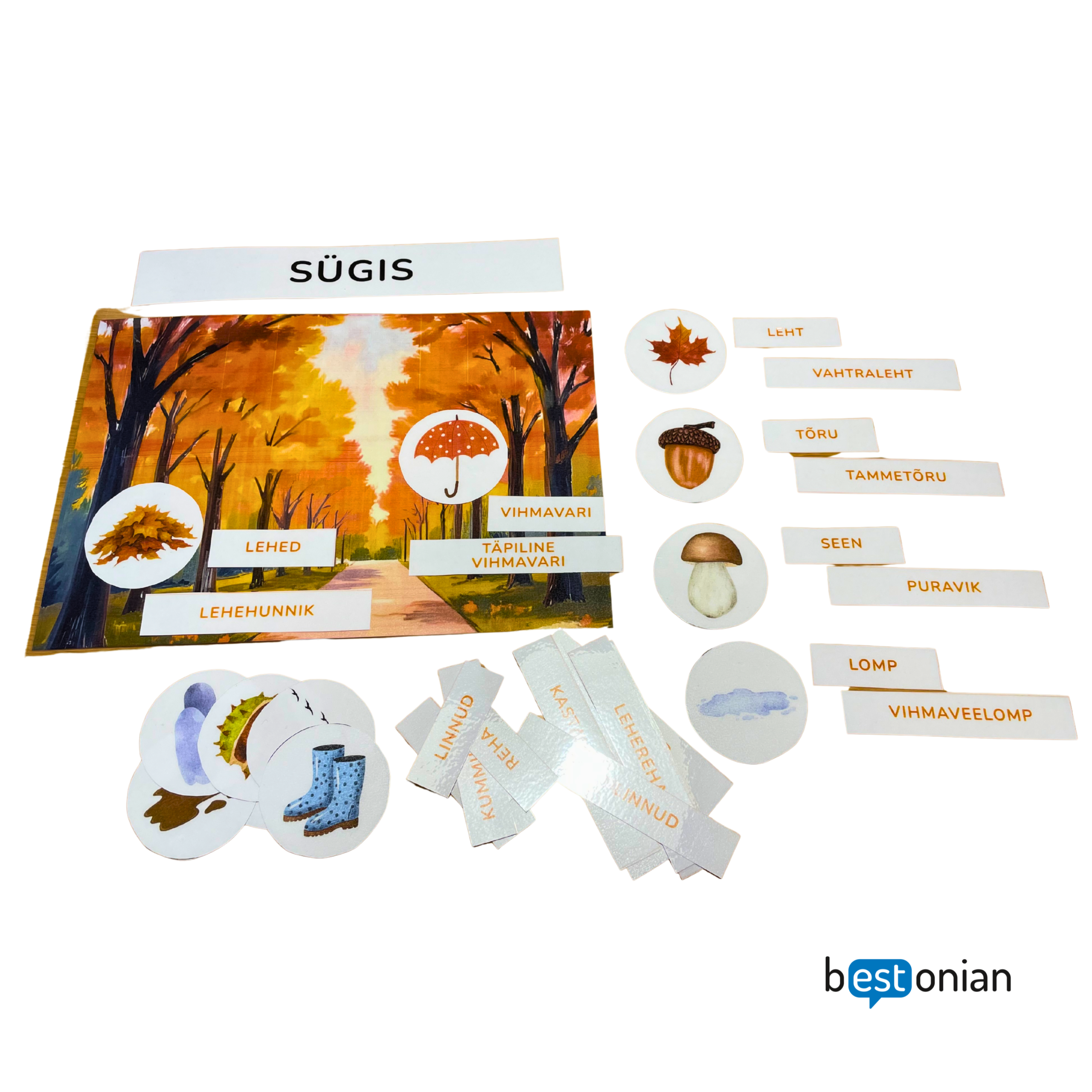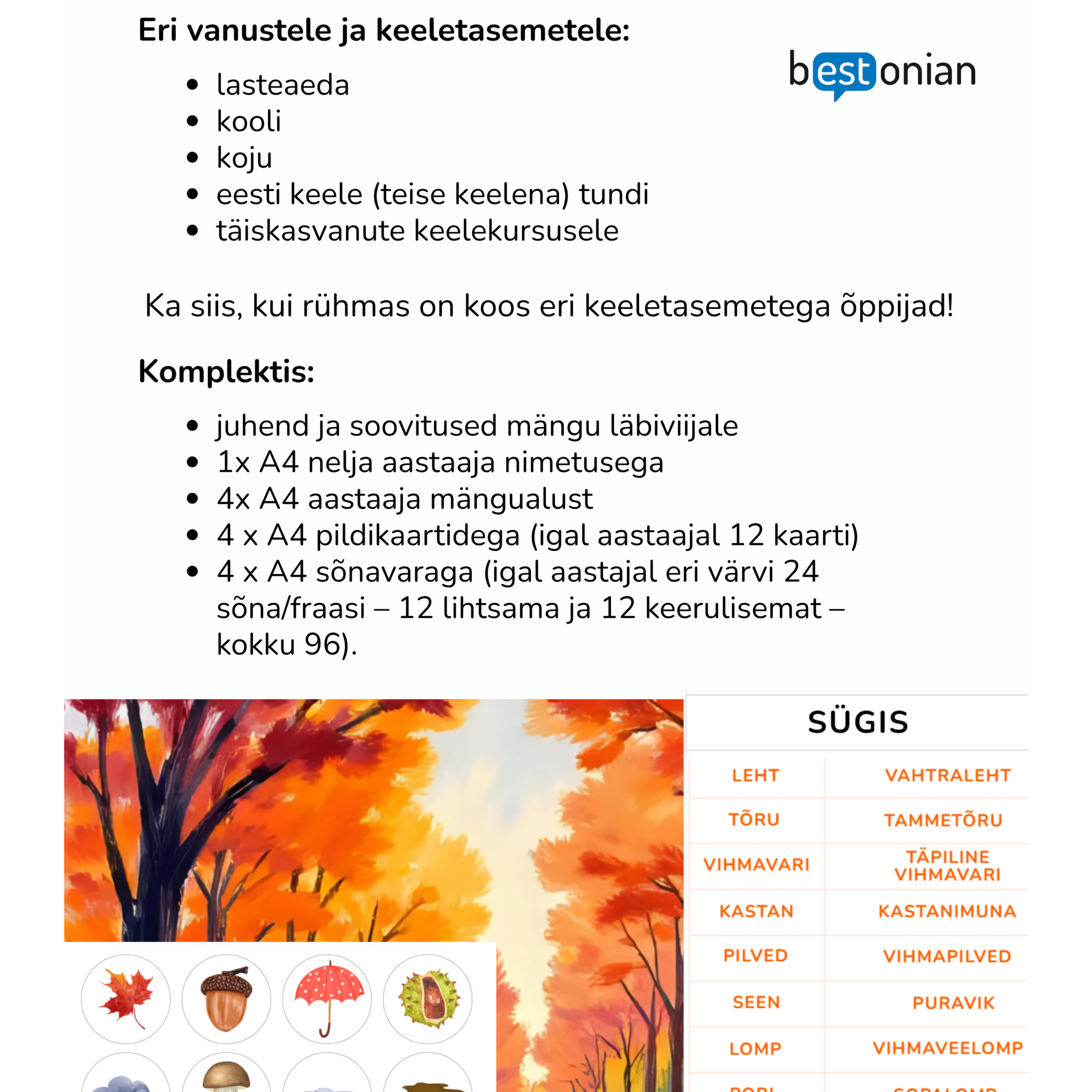 - 4 x A4 sõnavaraga (igal aastajal eri värvi 24 sõna/fraasi – 12 lihtsama ja 12 keerulisemat – kokku 96).