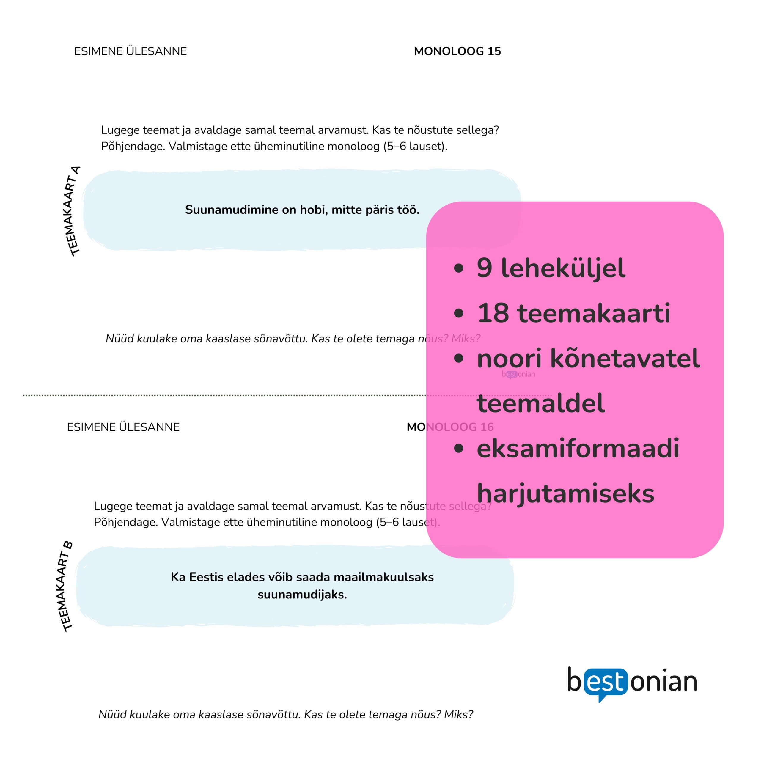 Eesti keele teise keelena riigieksami rääkimisosa esimese ülesande lisamaterjal sisaldab PDF-faili 18 teemakaardiga 9 leheküljel. Teemakaardid on noori kõnetava temaatikaga, aga sobivad ka täiskasvanutele, näiteks eesti keele kursusel kasutamiseks. Näited teemadest: sotsiaalmeedia ja suunamudimine, rahatarkus, kõikidega arvestav elukeskkond, tehisintellekt jm.