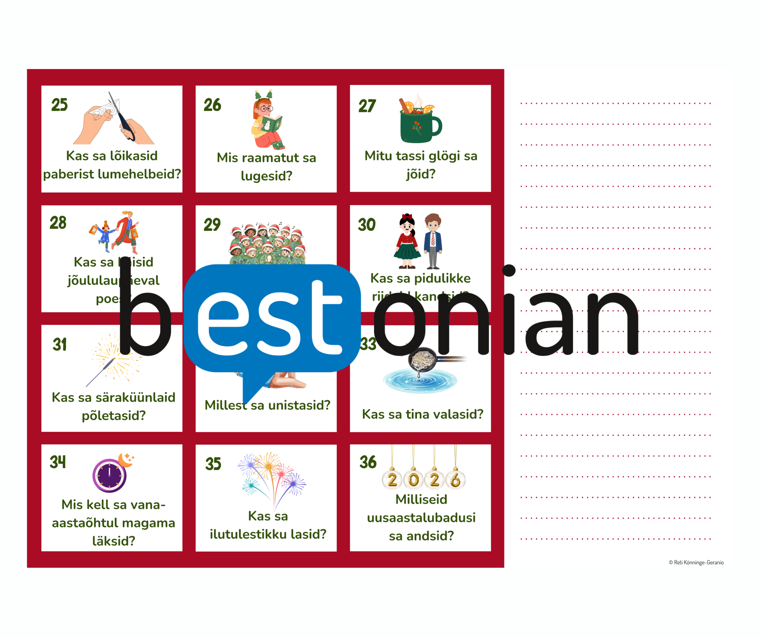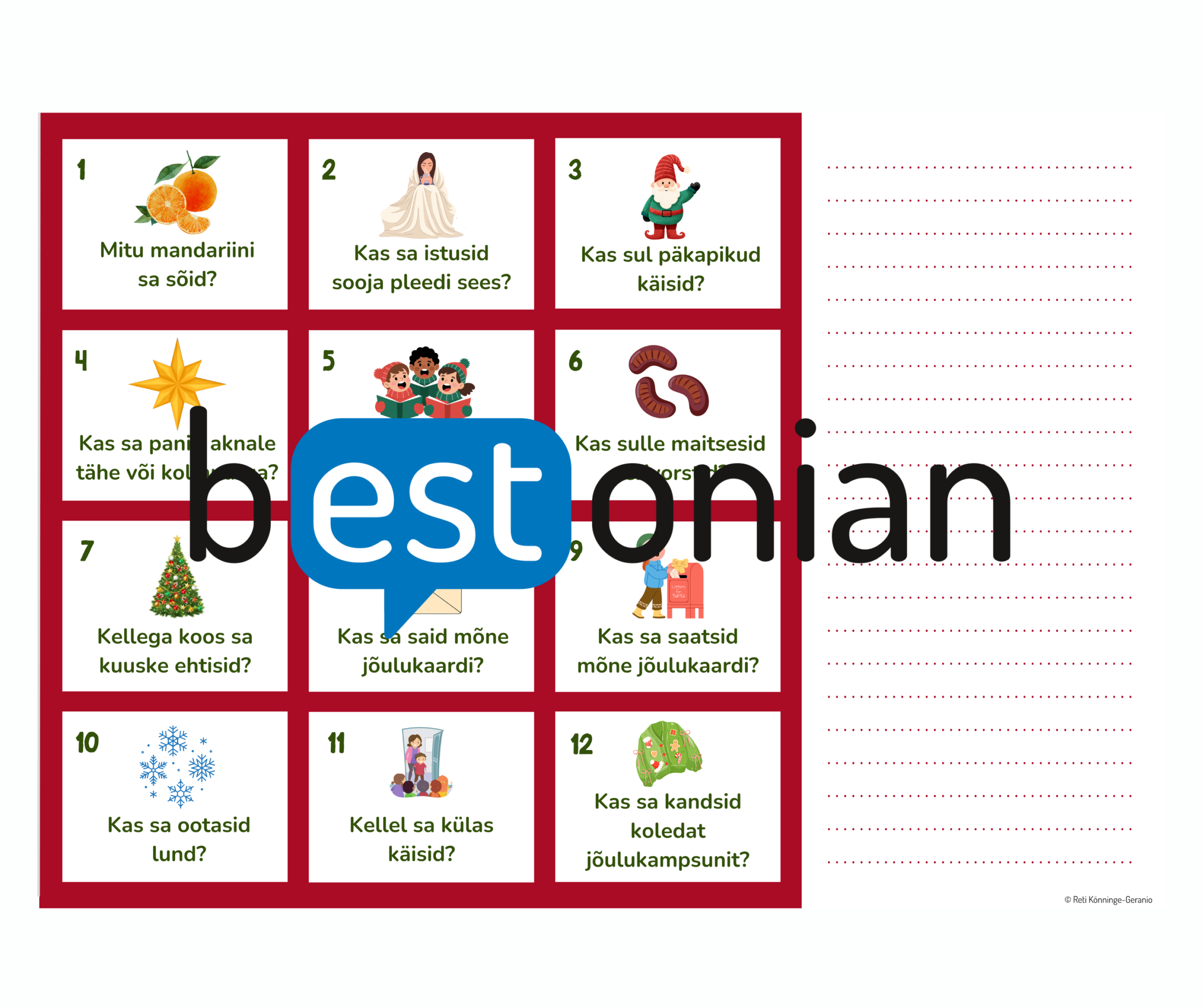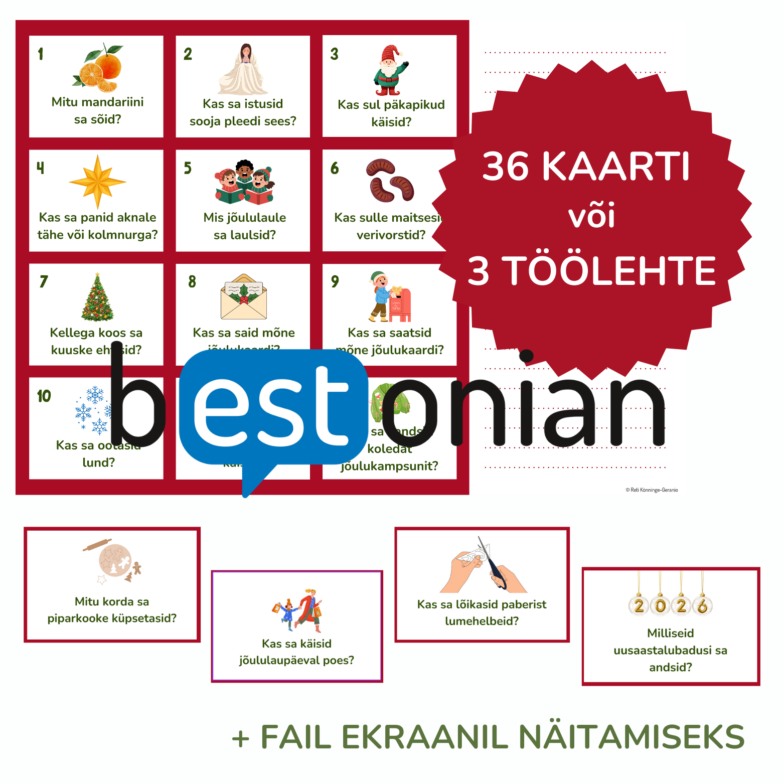 Materjalis on 36 nummerdatud ja illustreeritud sinavormis küsimust möödunud jõulupühade ja vana aasta lõpu kohta. Leidub nii kas-küsimusi kui avatud vastusega küsimusi. Sõnavara ja vormid on (ka tänu illustratsioonidele) algajale keelekasutajale sobilikud, aga vürtsiks sees on ka keerulisemat sõnavara, nt tina valama, uusaastalubadusi andma jms.