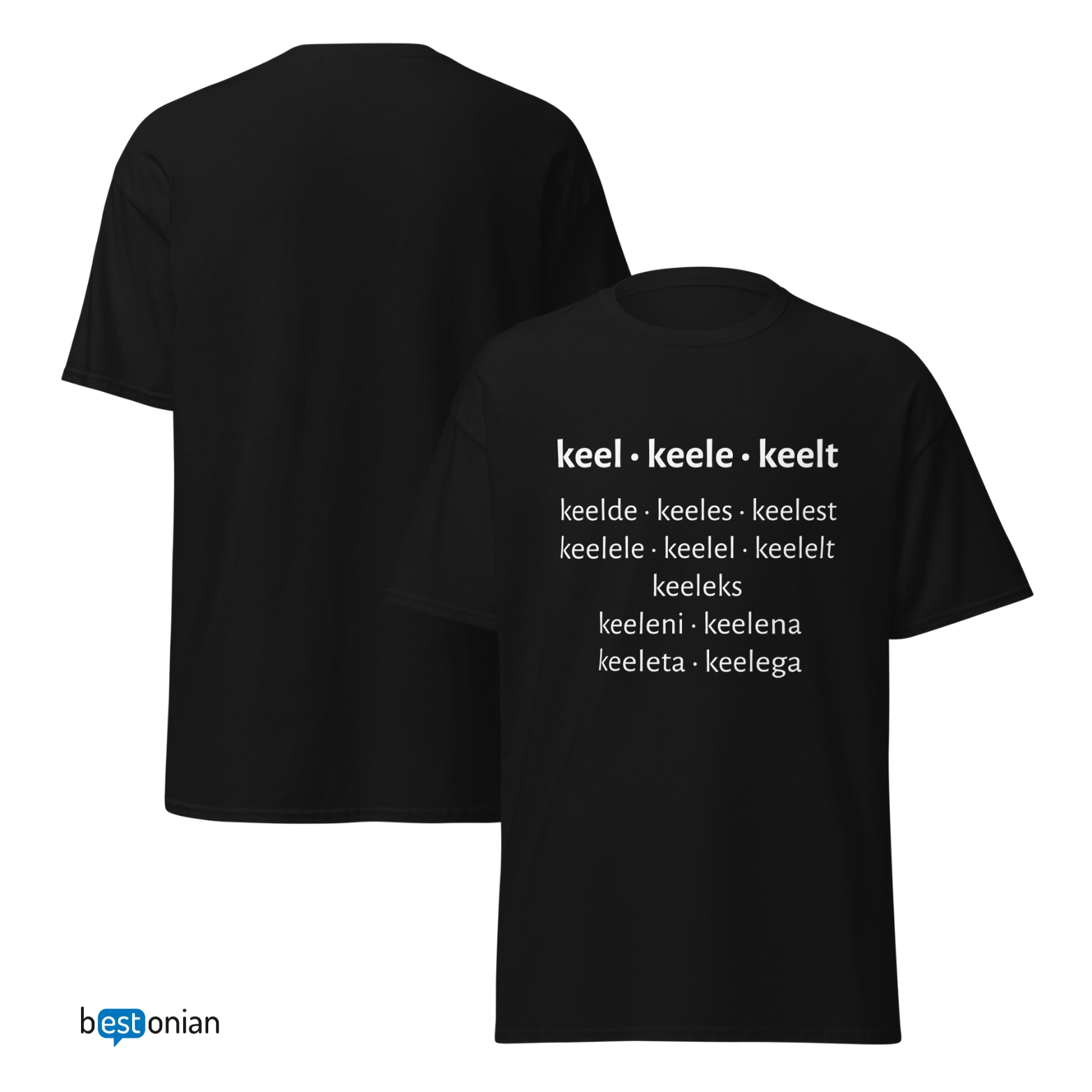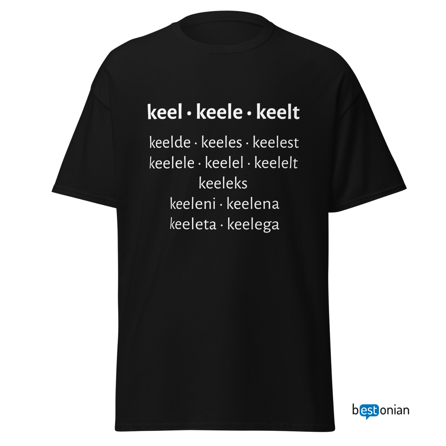 Must unisex T-särk valge trükiga tõelisele keelearmastajale või õpetajale, kes tahab käänetetabeli puust ja punaseks teha.